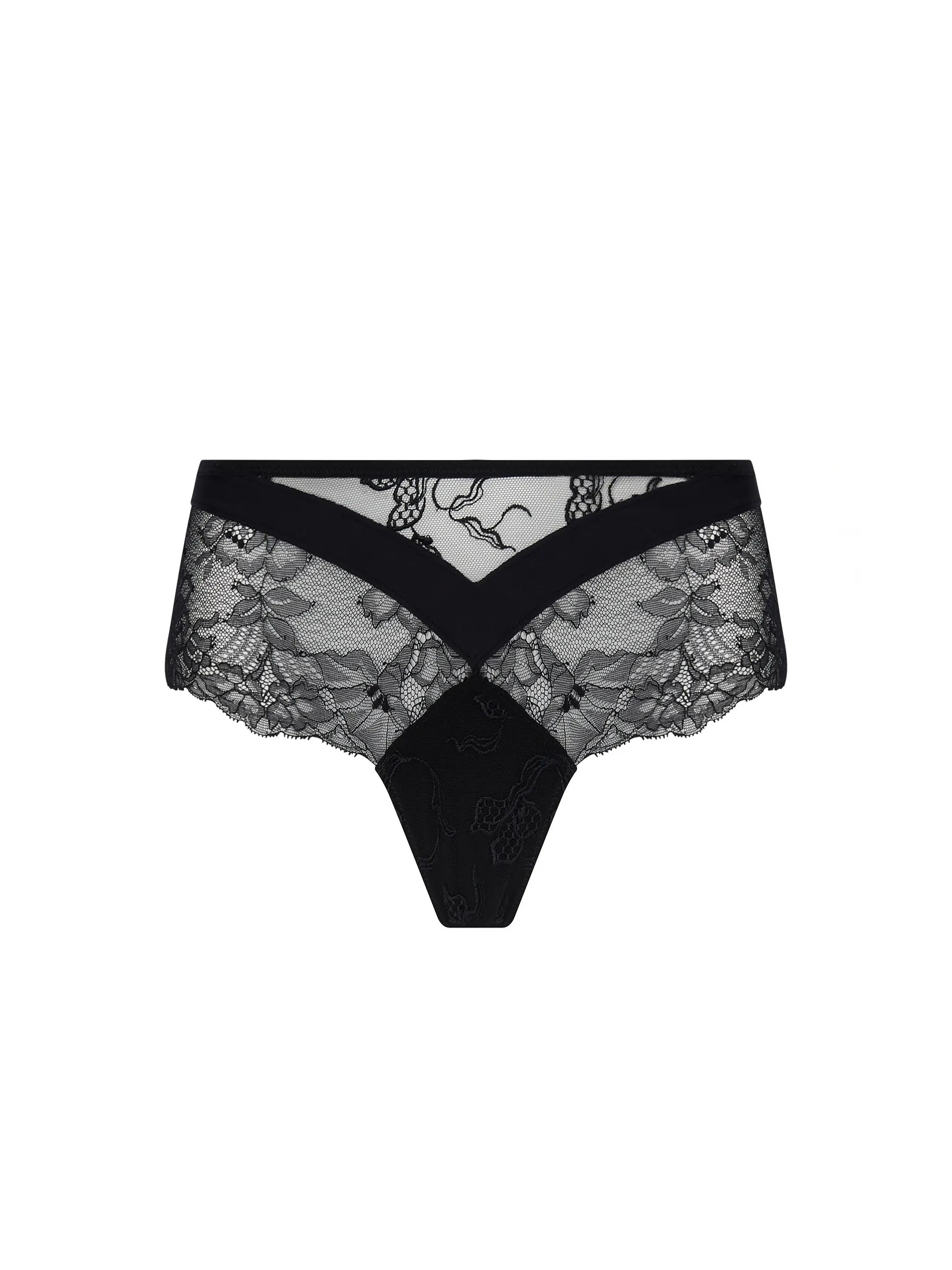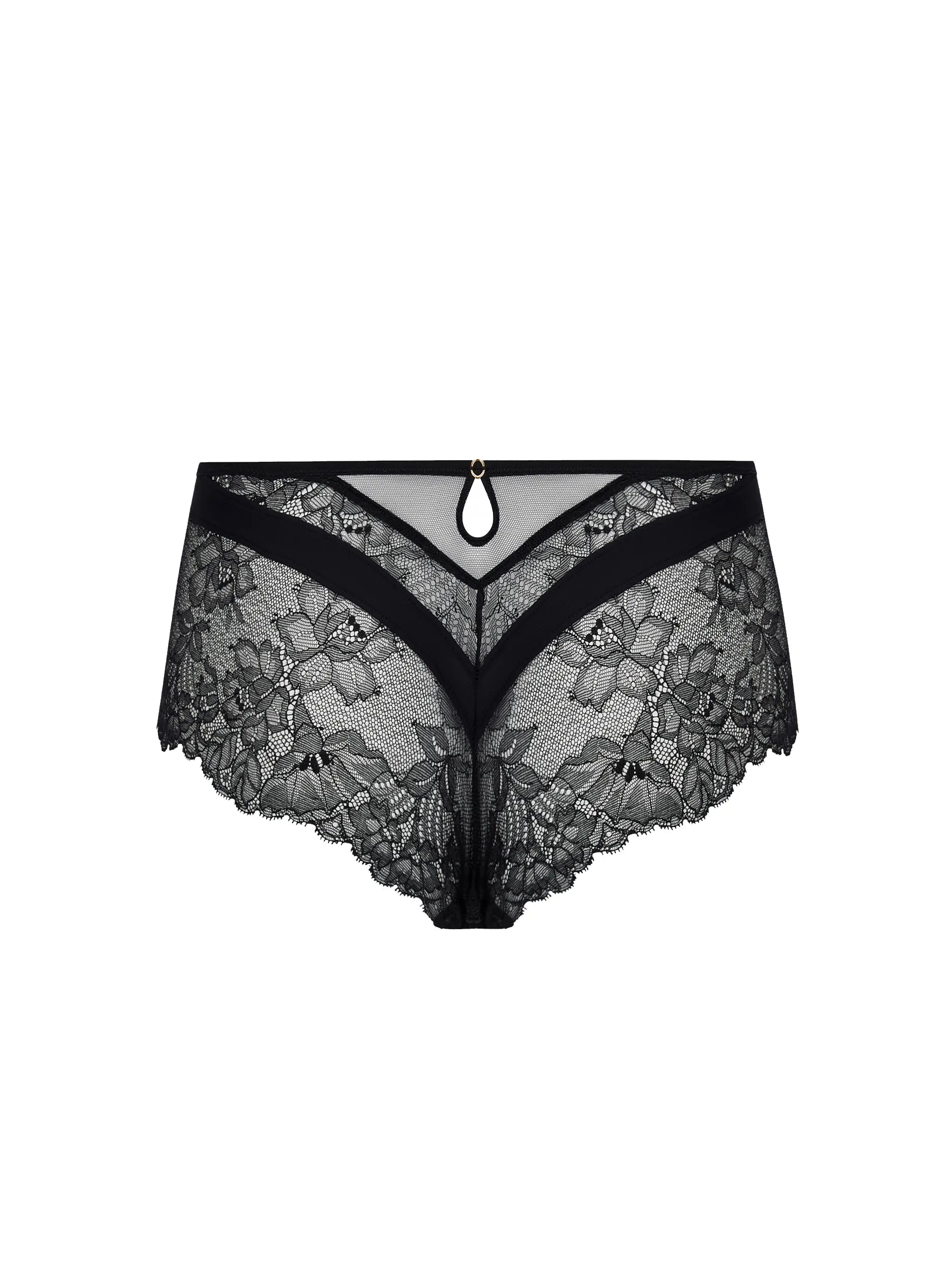 Multi-fabric boyshorts with scalloped Leavers lace at the thighs. The front top is made of a triangle of embroidered laize, accentuated by a V-shaped mesh band. The bottom front, pointed, is embroidered laize lined with cotton. The top back is composed of a tulle triangle adorned with a drop and a small ring at the waist. Below, a band of lace and a V-shaped mesh band alternate.