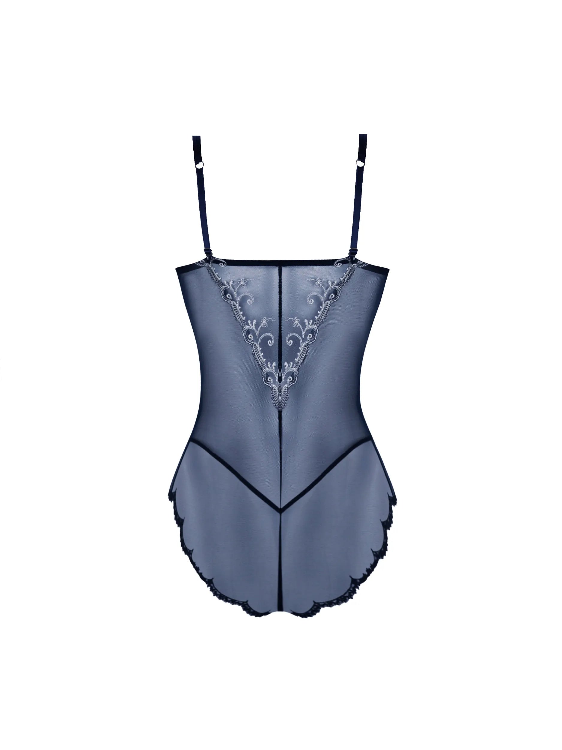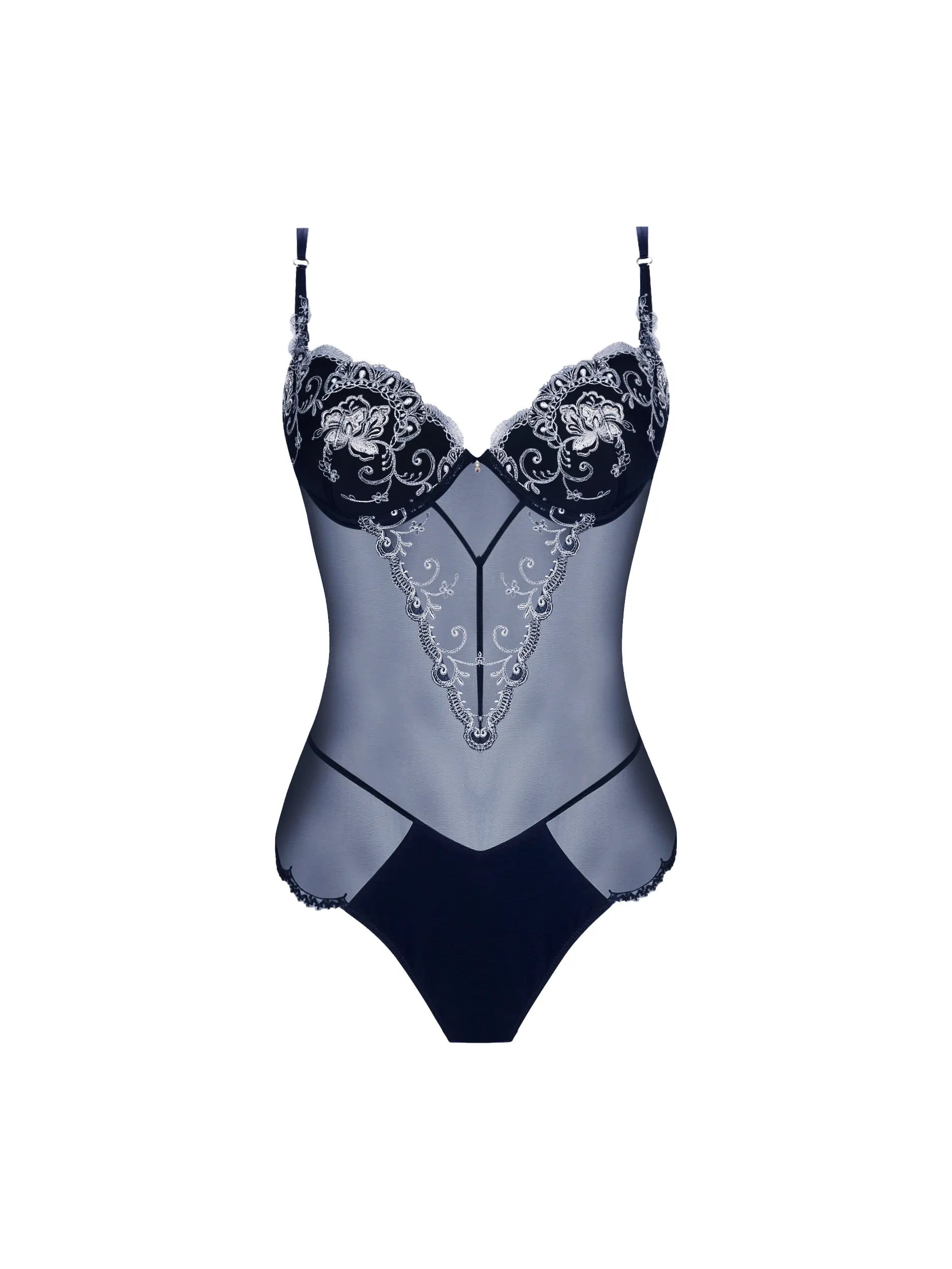 Bodysuit with padded cups covered with multi-thread embroidery on invisible tulle, scalloped at cleavage. The tulle body is embellished with a V-shaped embroidered braid cut-out on the upper front and back. The thighs are enriched by a scalloped embroidered band. The two-part straps are embellished with an embroidered floral motif at the base of the strap, followed by a metal ring. The cleavage is enhanced by a pearl.