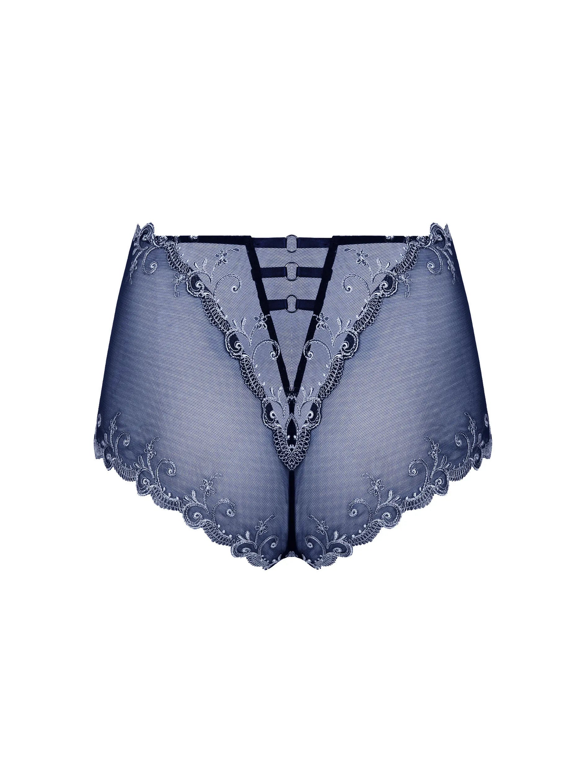 Sexy high-waist brief, plunging into the back, with an embroidered braid on the side and a coordinated embroidered laize in the middle front. The back is enriched with an embroidered applique and an invisible tulle triangle crowned with three golden beaded rings held in place by elastic satin ribbons.