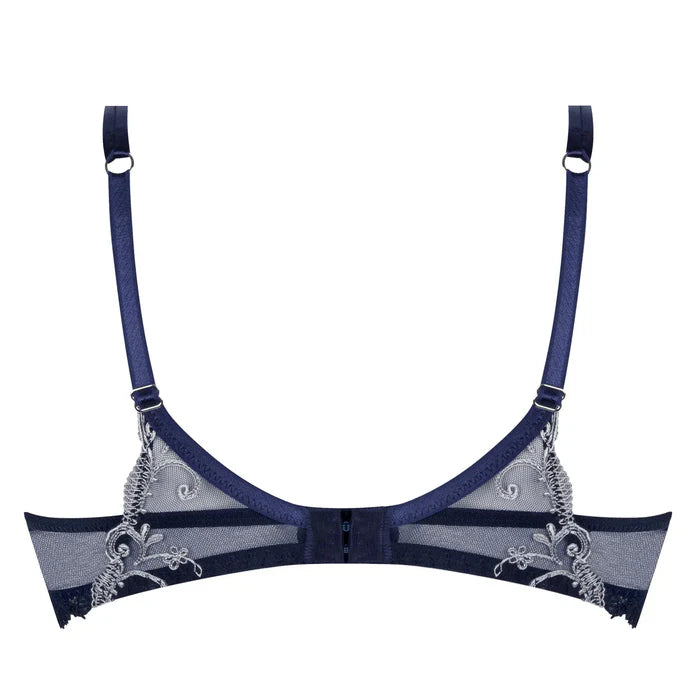 Multi-thread embroidered demi cups on invisible tulle, scalloped at cleavage. The embroidered, scalloped bra band on the front is enriched by an embroidered, scalloped braid cut-out on the back. The two-part straps are embellished with an embroidered floral motif at the base of the strap, followed by a metal ring. The V-shaped cleavage is enhanced by a pearl. Removable necklace sold separately.