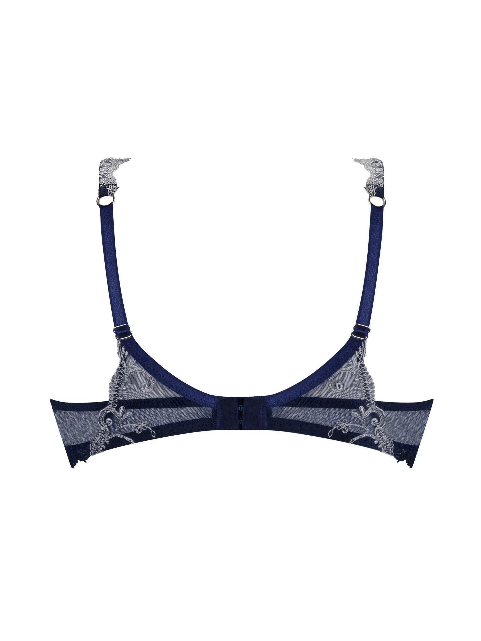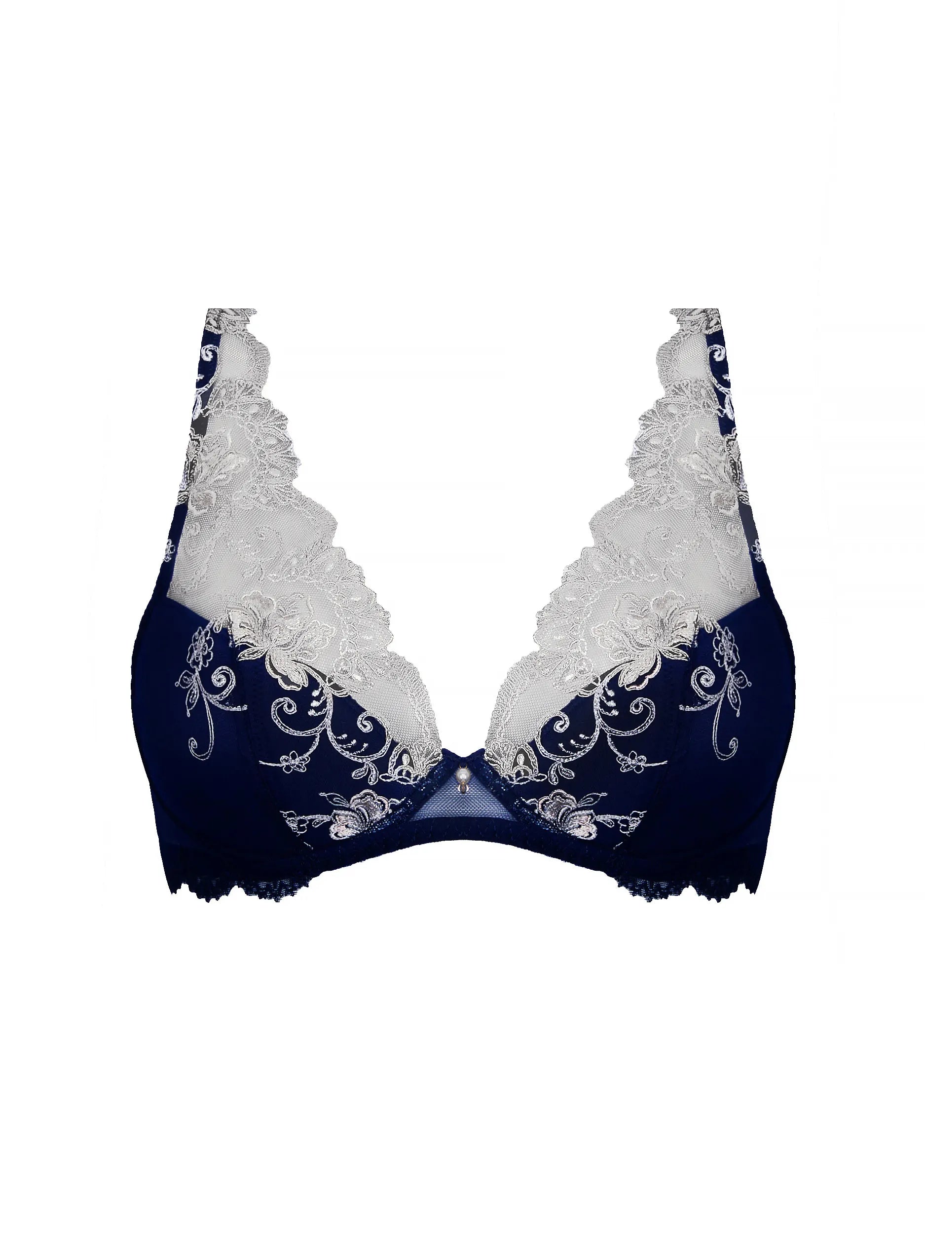 Plunging bra in multi-thread embroidery on invisible tulle, scalloped at clivage, low bonnet supported by foam. Scalloped embroidered bra band on the side, and enriched embroided back. The adjustable straps at the back extend the neckline at the front. The invisible tulle cleavage is enhanced by a pearl.
