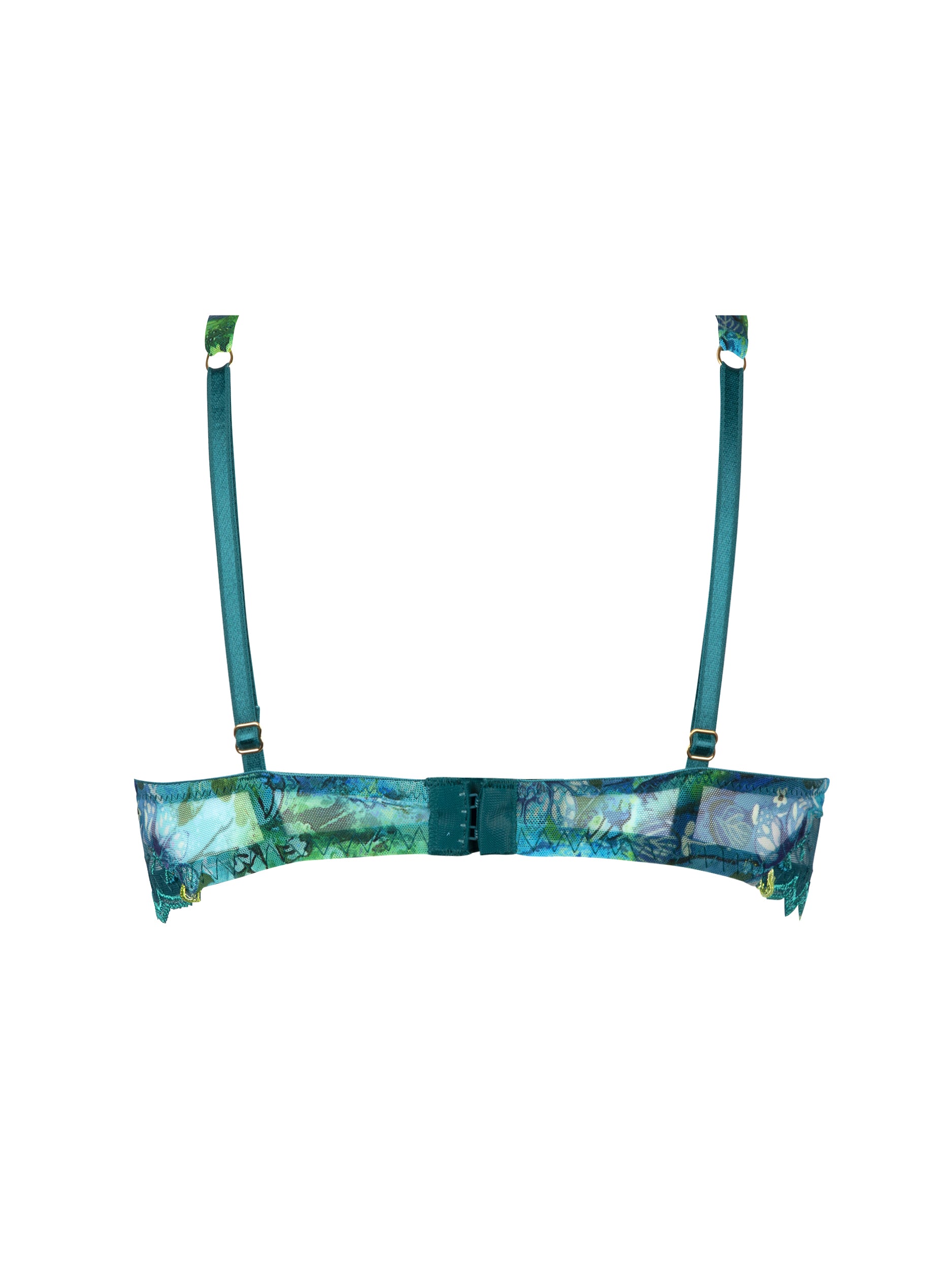 -This chic underwear is made from turquoise tulle enhanced with tone-on-tone, aquamarine or gold embroidery, reinterpreting the magic of nature awakening, for a dazzling ethereal beauty.