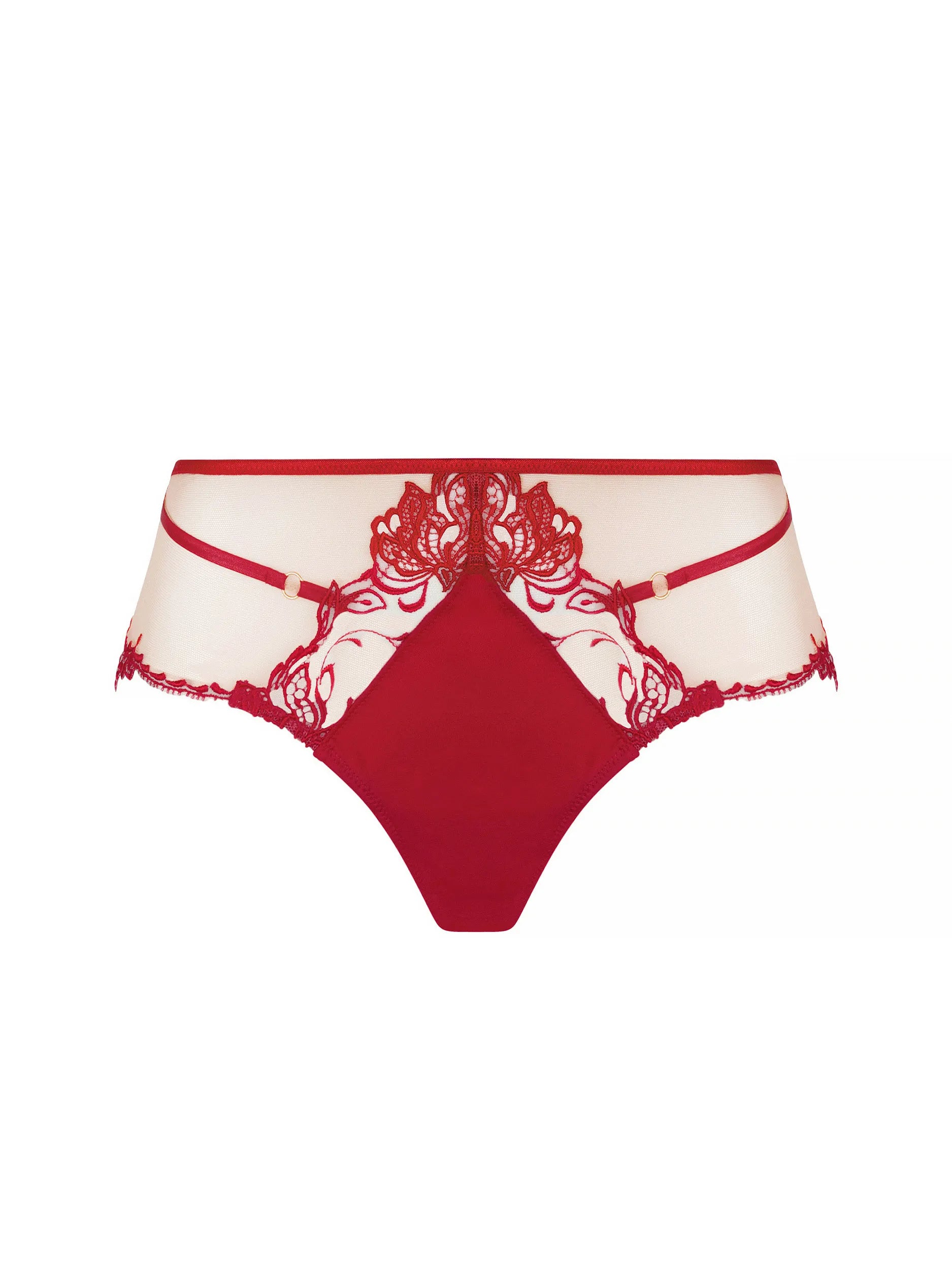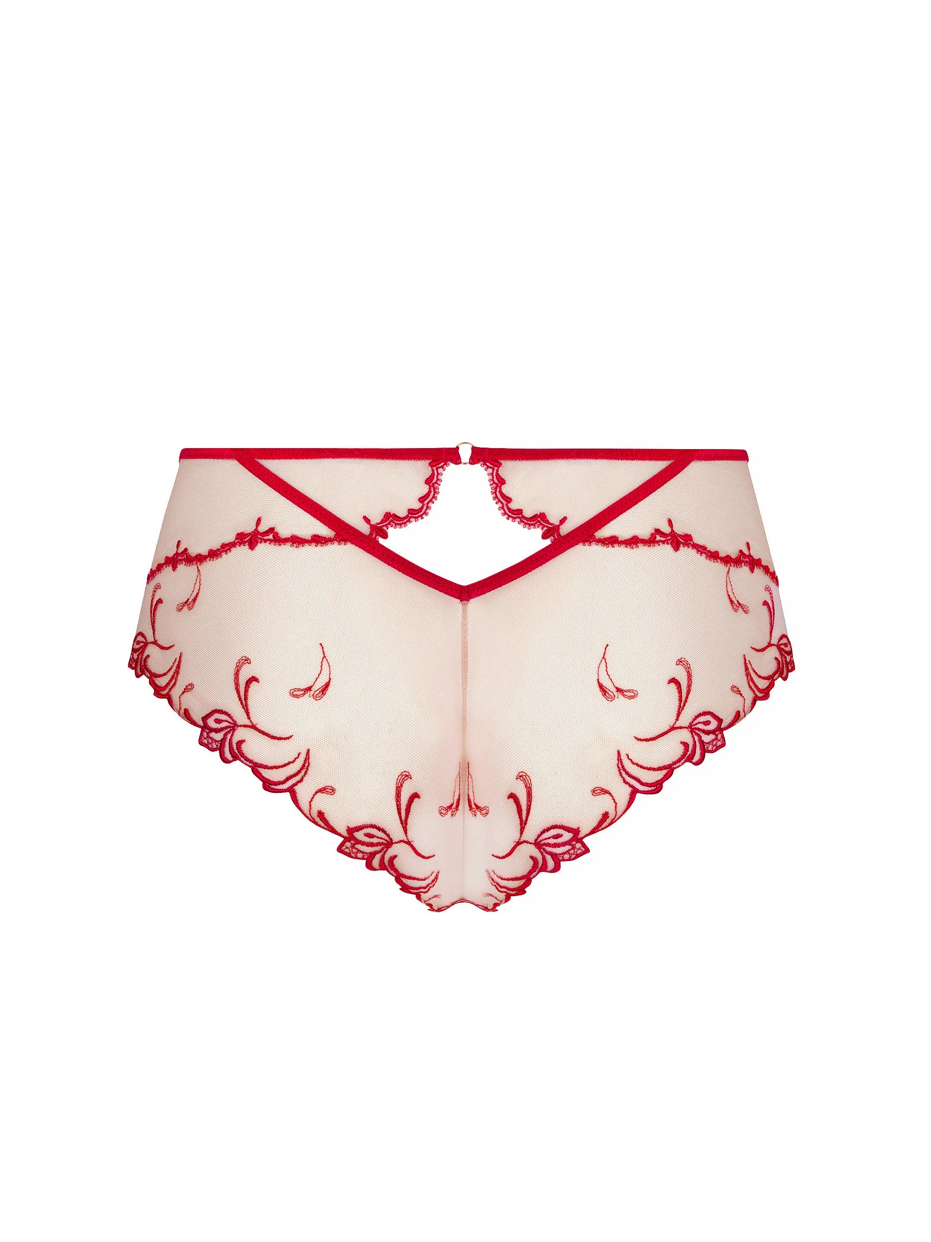 Enhanced mesh with embroidered band on transparent tulle forming a red flower. The sides are embellished with a set of red straps with gold rings on nude tulle, the waistline is defined with a red border and detailed with a ring. The thighs are embroidered and scalloped with red pointed edging and openwork on the upper back.