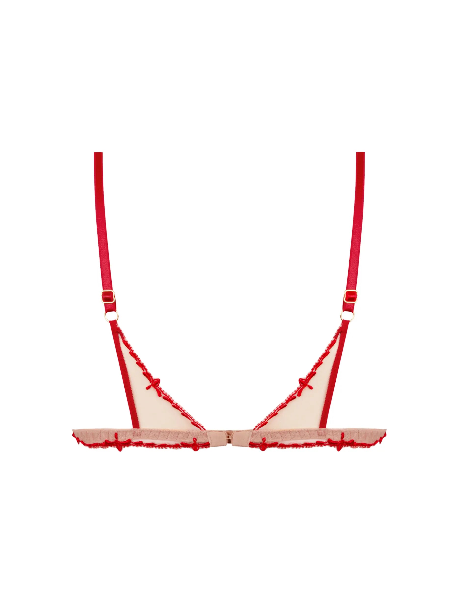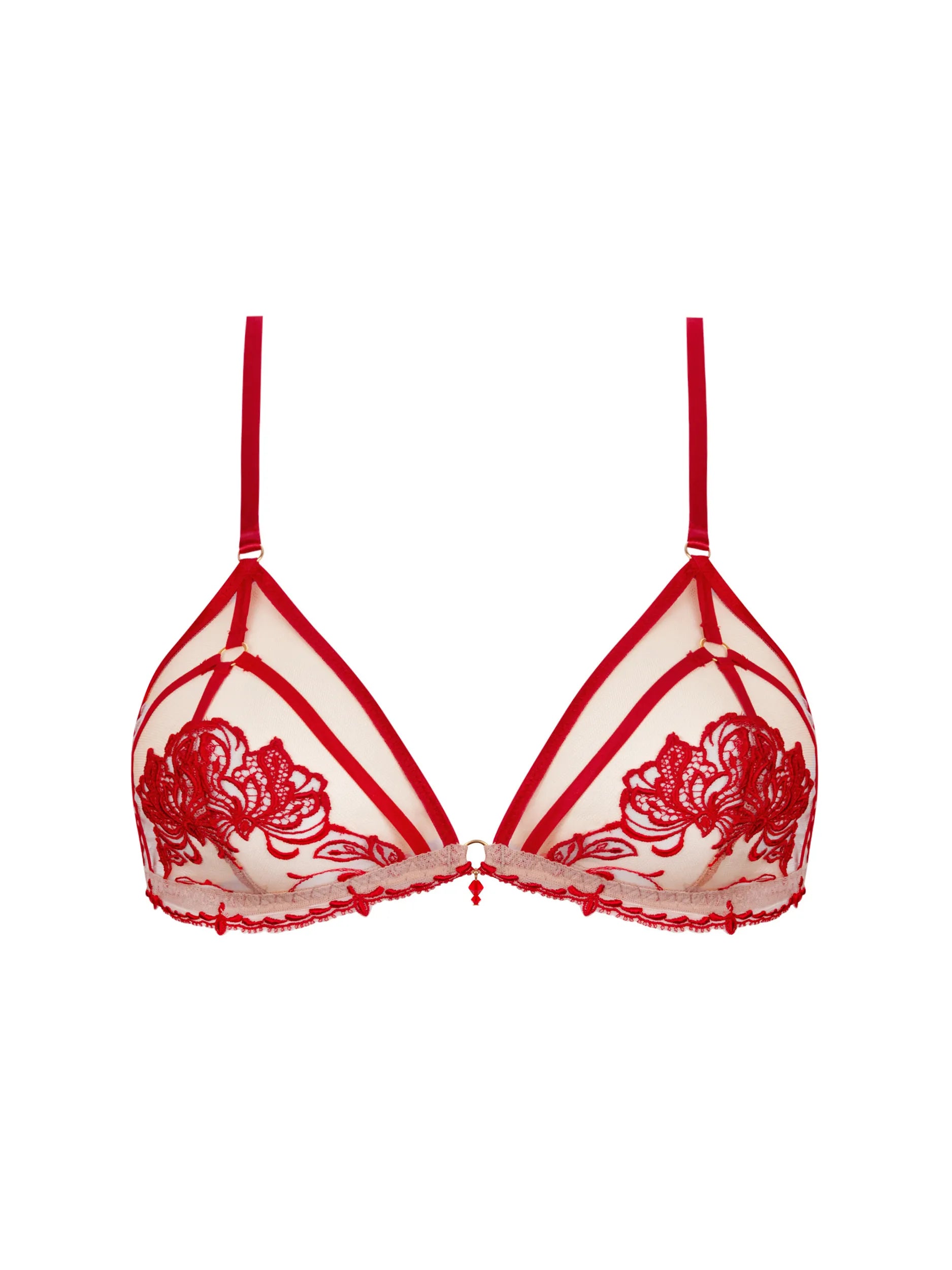 Transparency effect and red straps held together by gold rings. Red embroidery forms a flower that hides the breast. Ruby tassel jewel at cleavage, bra band with scalloped back triangle and red border.