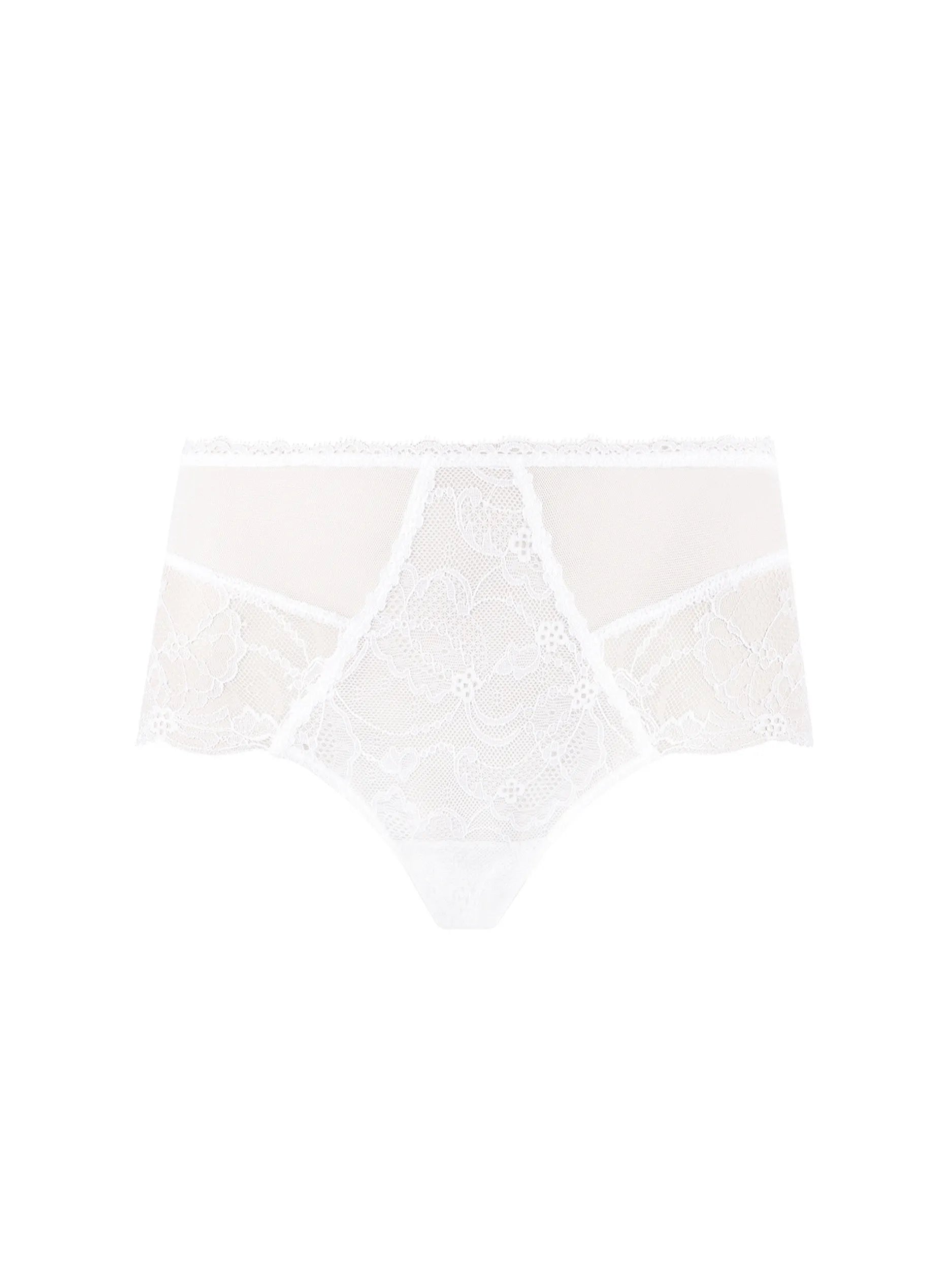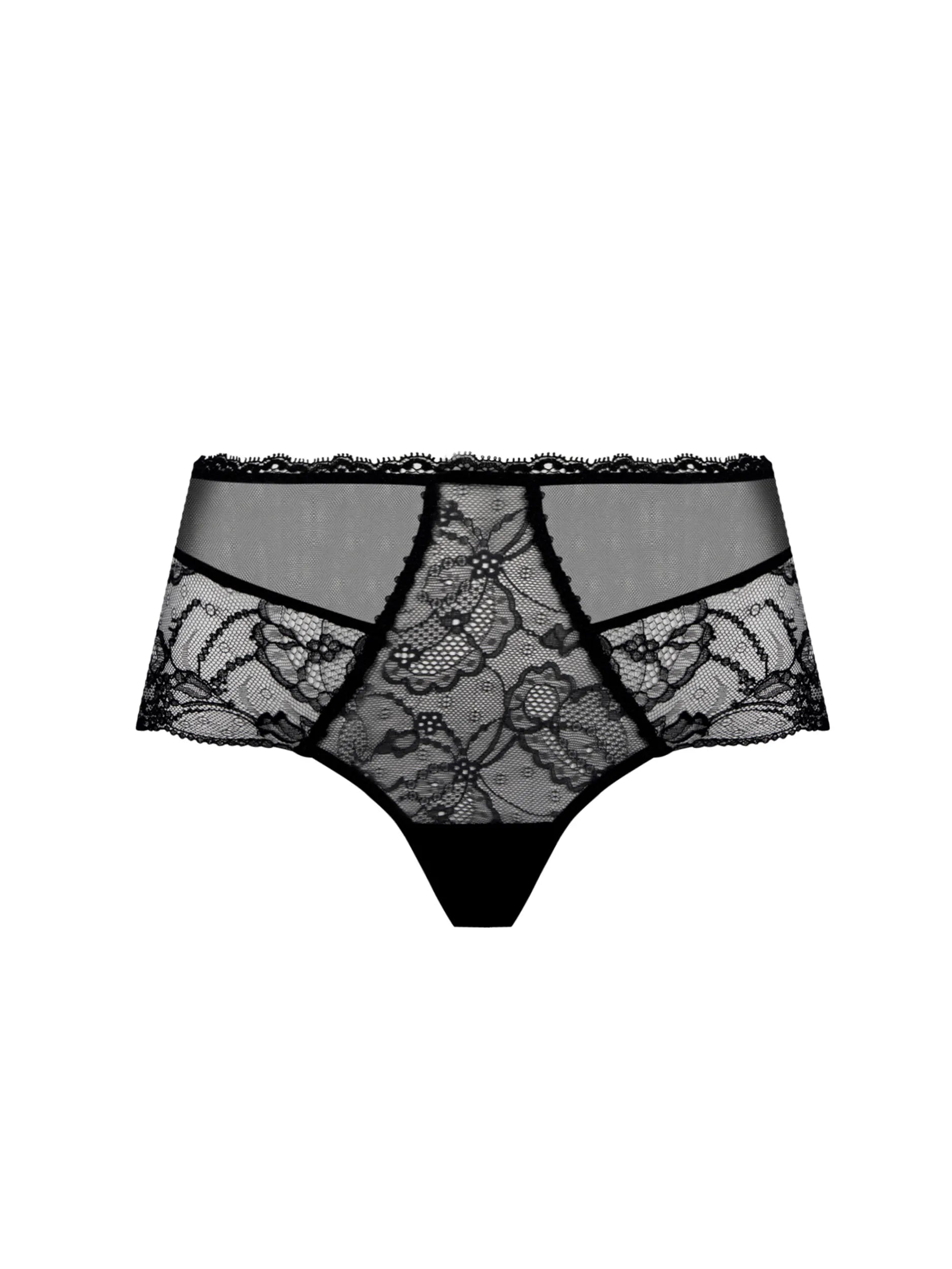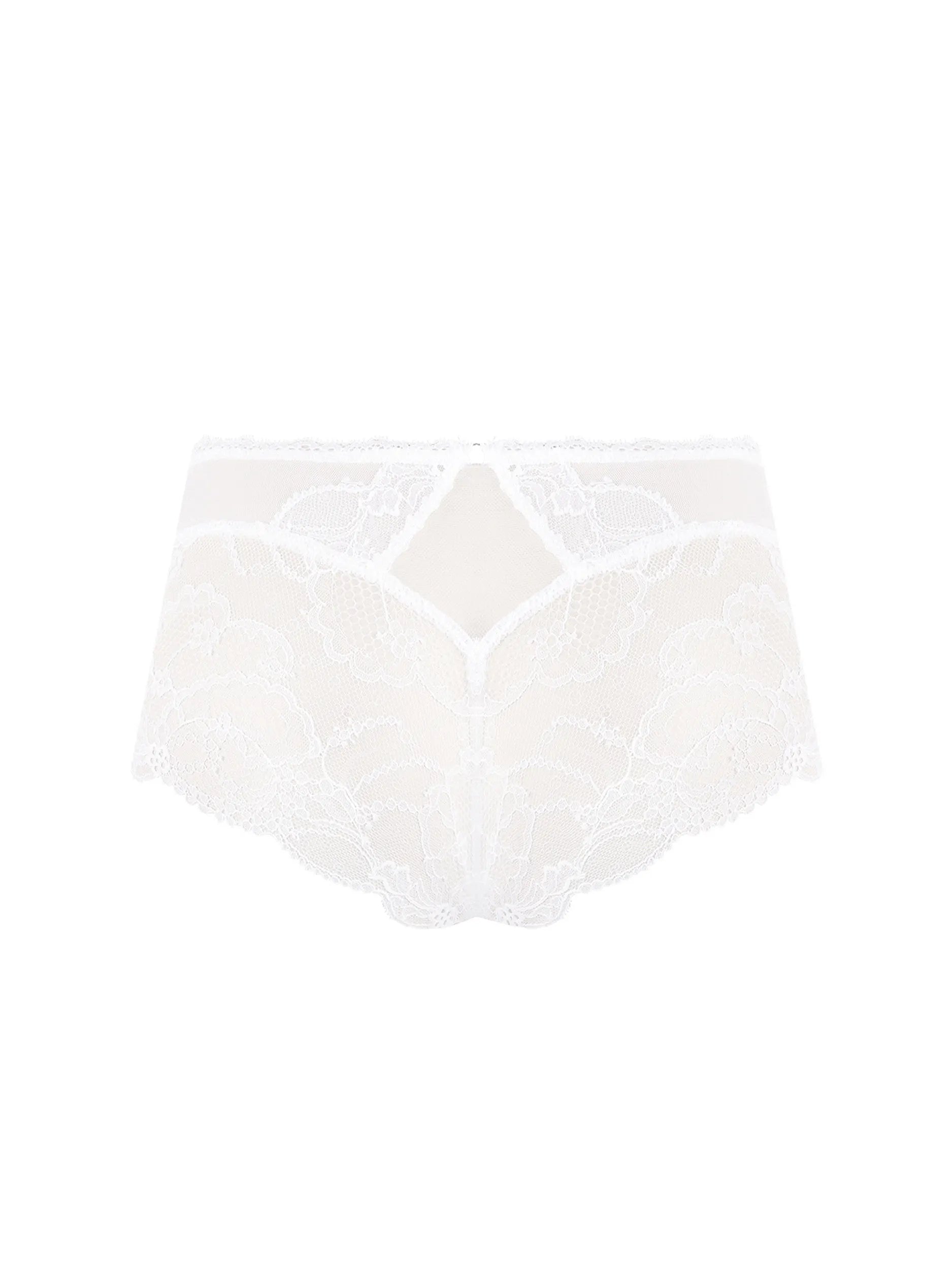 Shorty in Leavers lace and tulle scalloped at thighs. The upper back features a sheer tulle triangle embellished with a small flower braid band and a silver ring. A small lace braid emphasizes the waistline.