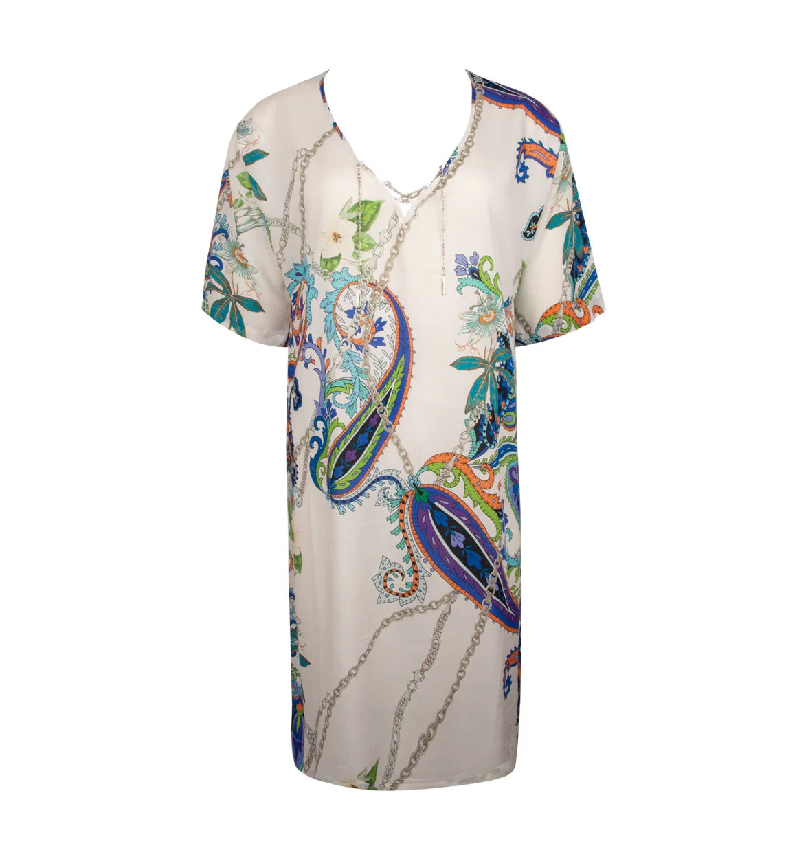 This white base paisley print tunic will enchance every tan and add glamour to your holiday wardrobe with green, blue, orange and purple tones and a silver chain detail. The tunic features a v - neckline with a criss cross silver chain. See matching swimwear in various styles to complete the look.