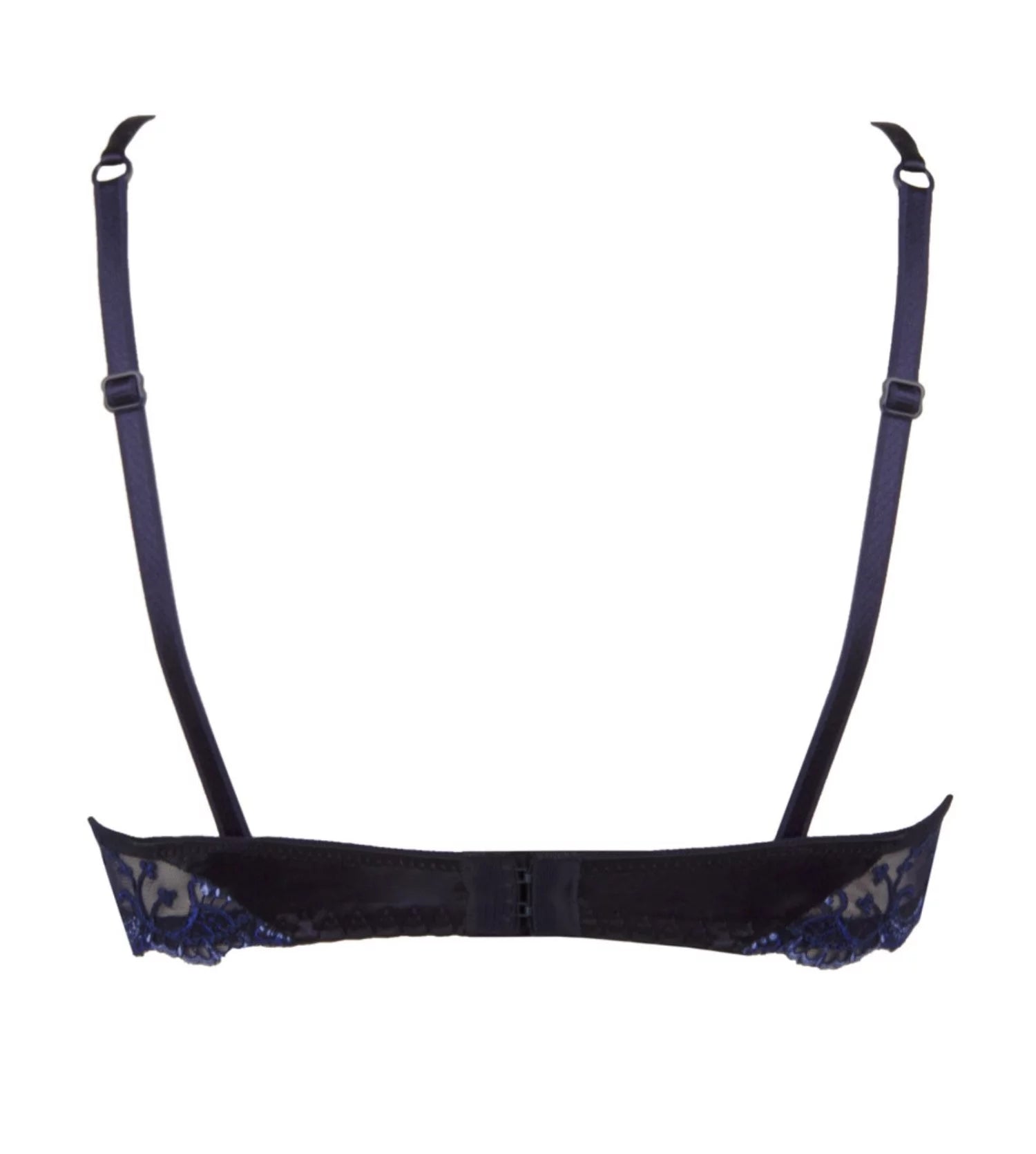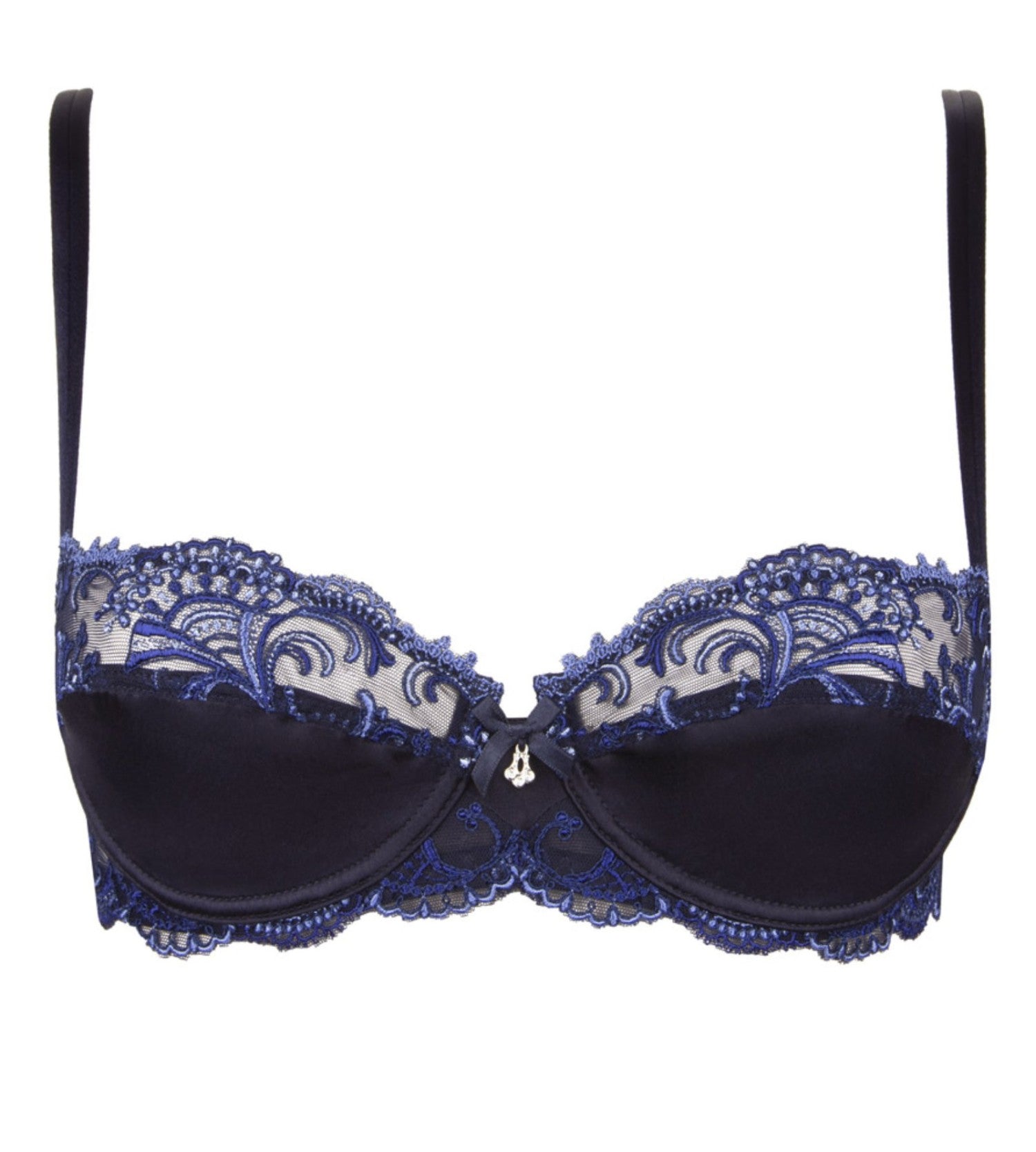 The Splendeur Soir half cup bra by Lise Charmel is updated for the new Season in Splendeur Bermudes which is a deep navy with blue embroidery details. The silk used in the collection is truly sumptuous and when combined with the blue embroidery and the Swarovski jewel at the centre creates a truly luxurious piece. The half cup bra is low cut and features slim fully adjustable straps.